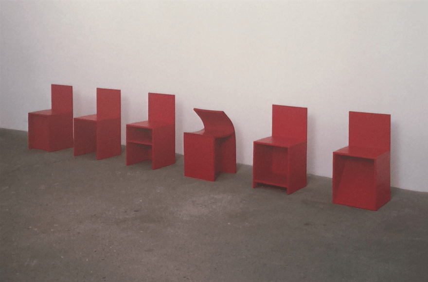 Donald Judd chairs, lipstick, wood, rubber